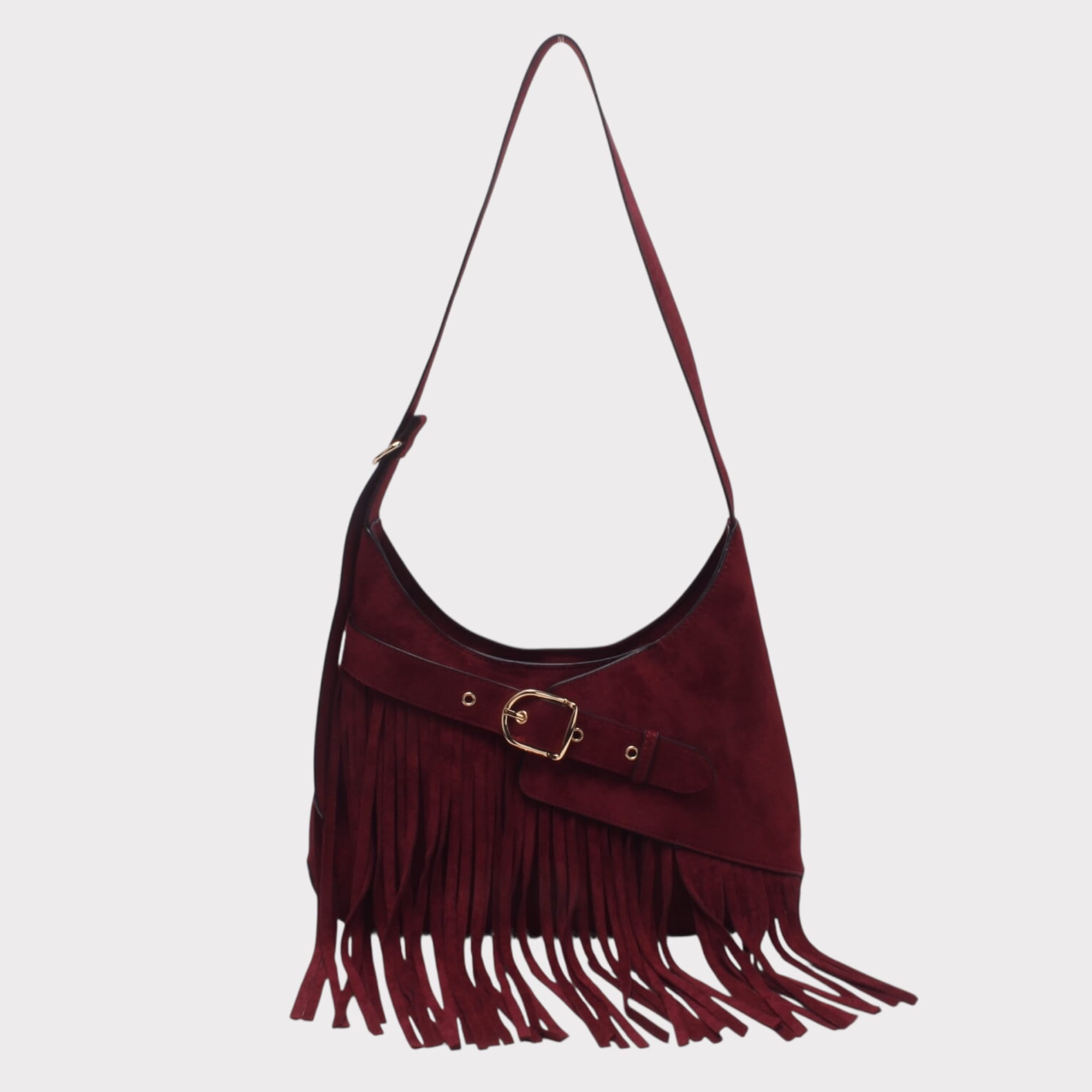 Sac porté épaule, avec frange . Fermoir zip et fermoir decorative.