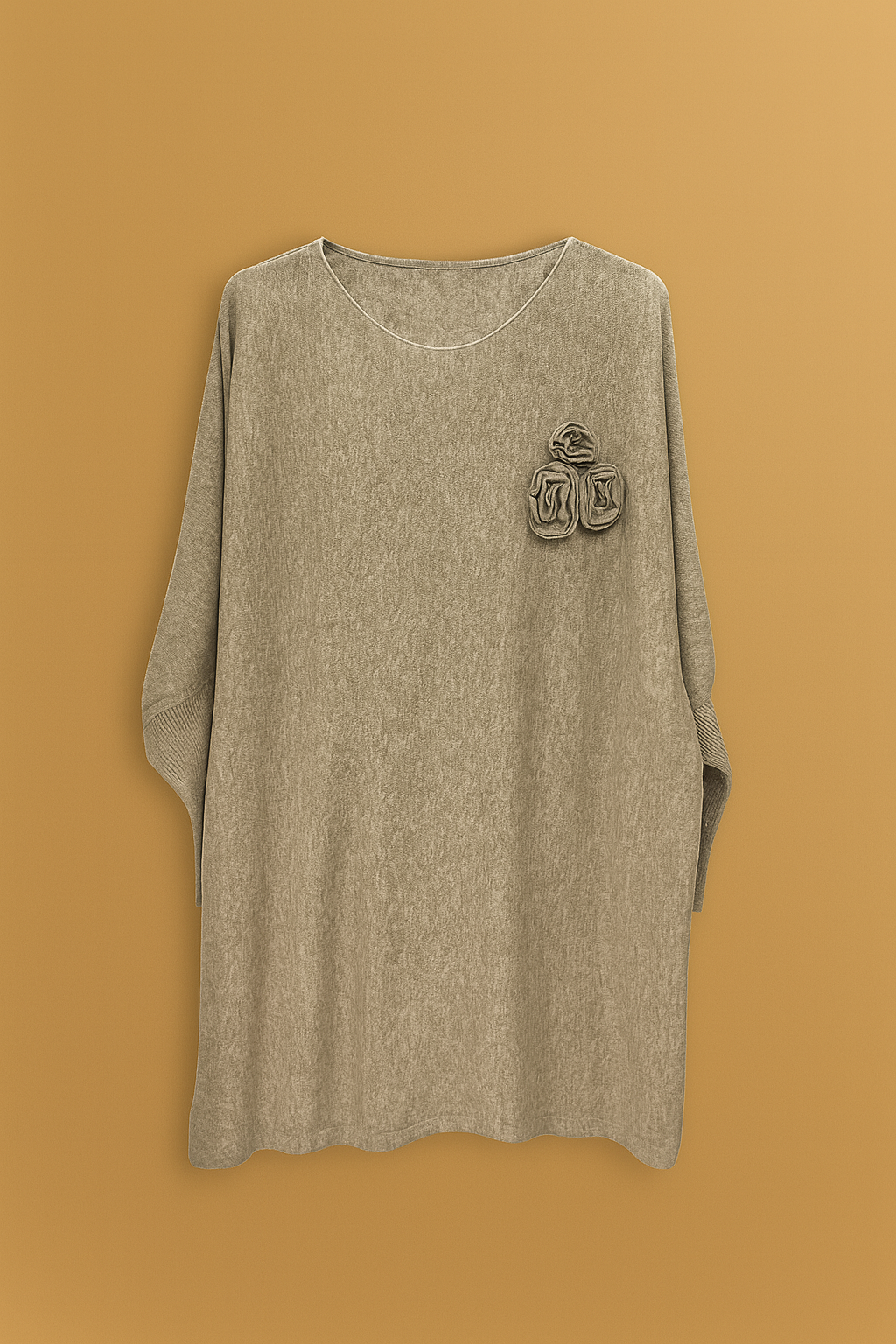 Pull grande taille en maille ultra douce, idéal pour un look à la fois chic et confortable. Ses manches chaussettes resserrées et sa coupe fluide subliment toutes les silhouettes. Détail élégant : deux fleurs ton sur ton sur la poitrine pour une touche féminine raffinée. Parfait avec un pantalon noir ou un jean.