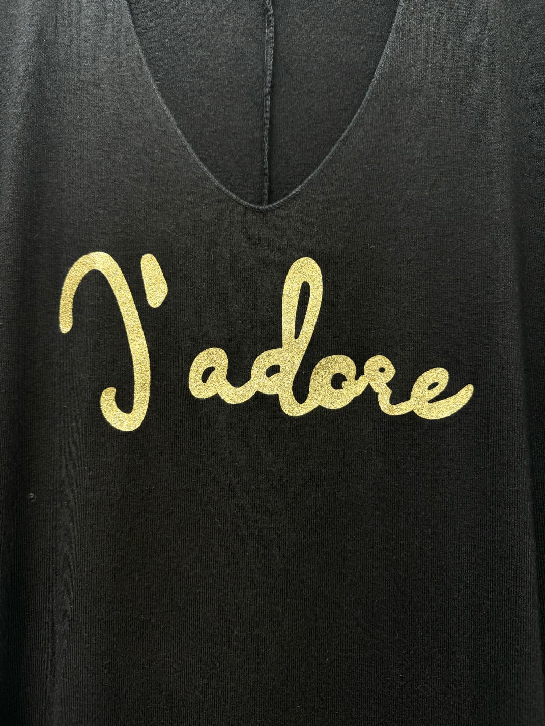Pull grande taille en maille douce avec inscription dorée "J’adore". Chic et confortable, il apporte une touche élégante et moderne à votre tenue. Parfait à porter avec un jean ou un pantalon noir pour un look tendance et féminin.