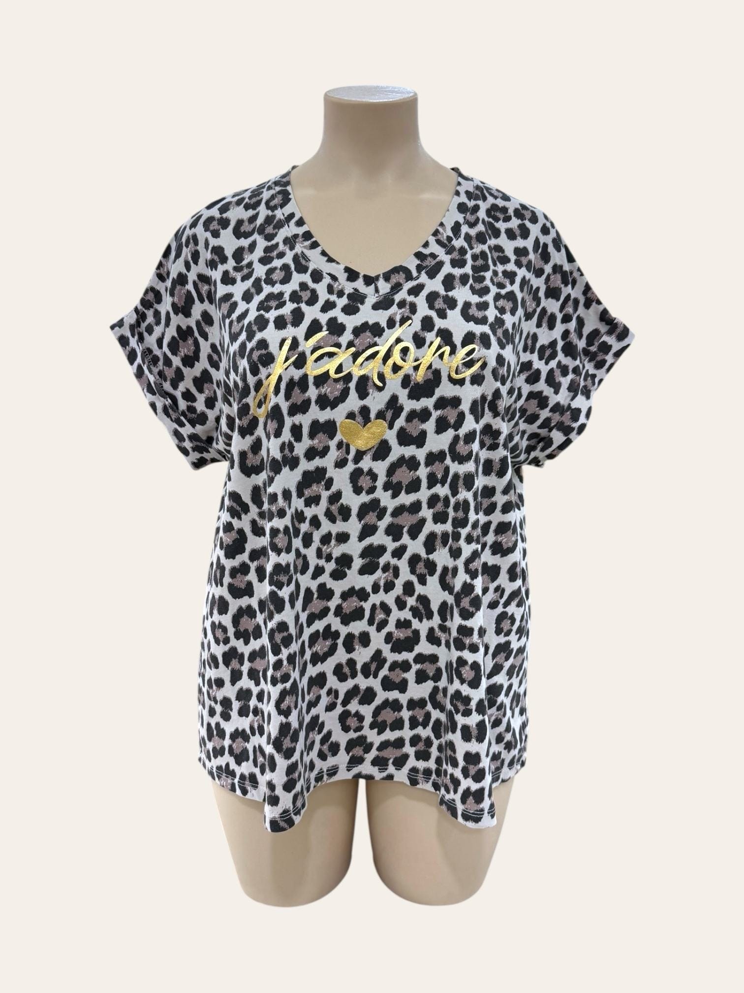 Imprimé léopard et inscription "J'adore" en doré avec petit coeur