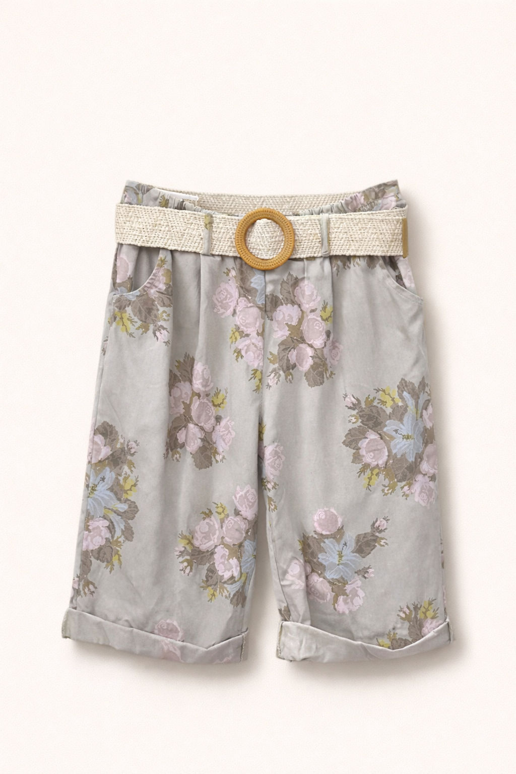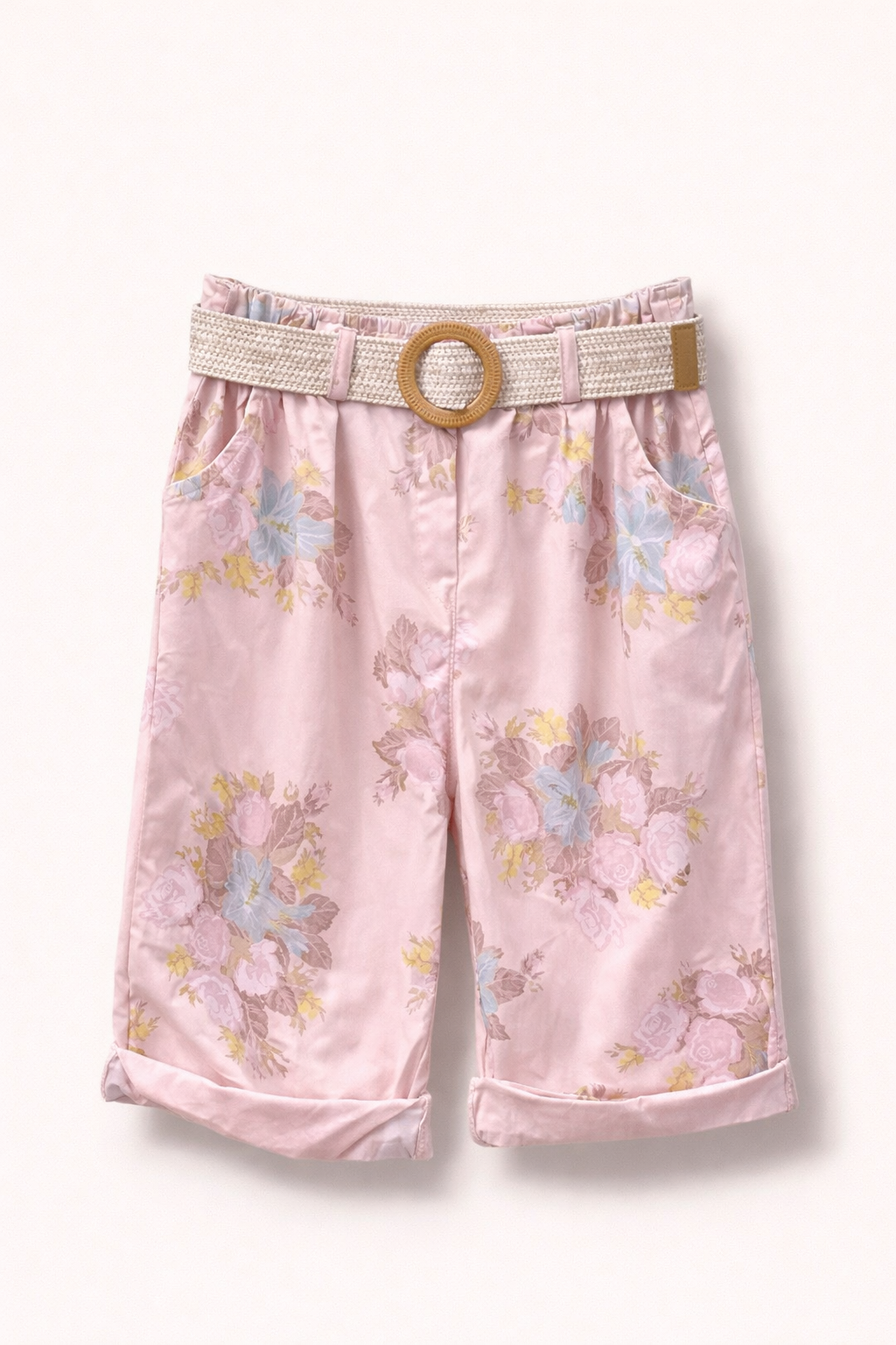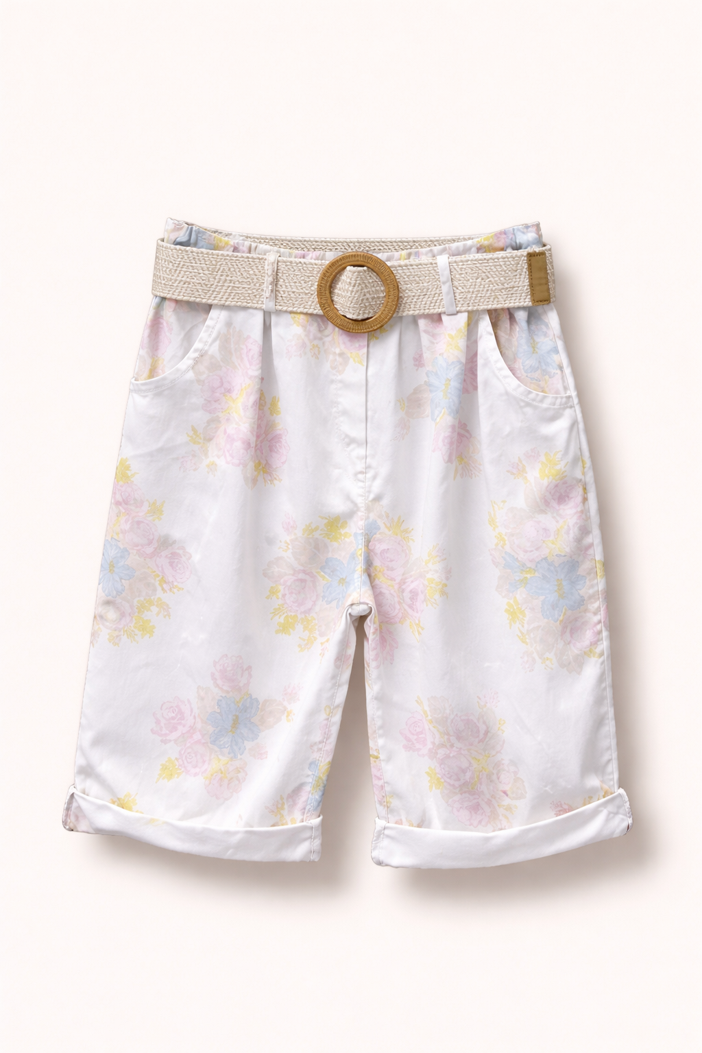 Bermuda fleuri grande taille, avec imprimé floral romantique qui apporte une touche de féminité assumée à chacun de vos pas. La ceinture en raphia tressé avec sa boucle ronde en bois est incluse — un détail bohème chic qui fait toute la différence.