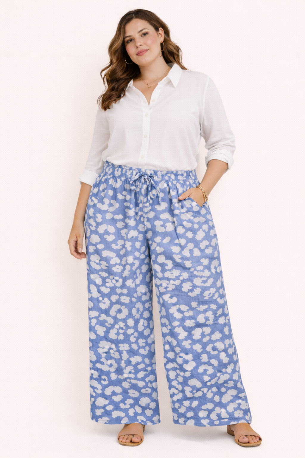 Sa taille élastiquée s'adapte à toutes les morphologies sans comprimer, tandis que ses jambes ultra-larges créent un effet allongeant et élégant qui sublime les courbes.