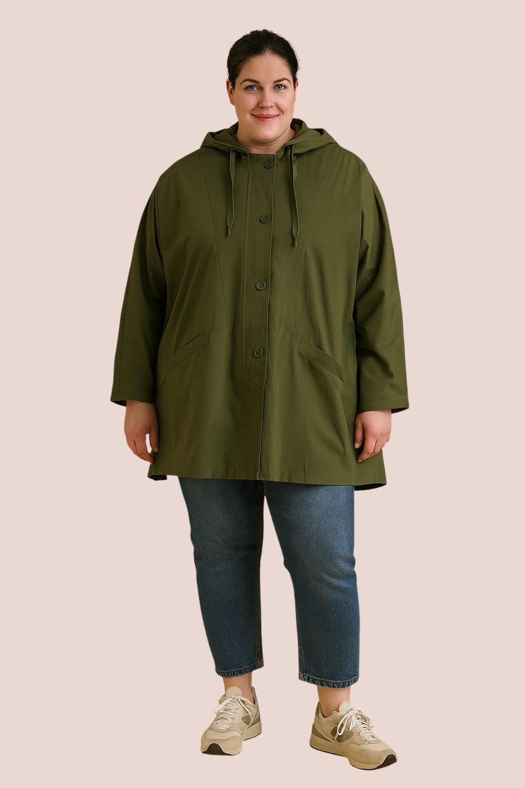 Veste parka grande taille, coupe droite. Fermeture boutons, poches latérales et capuche (Non imperméable)