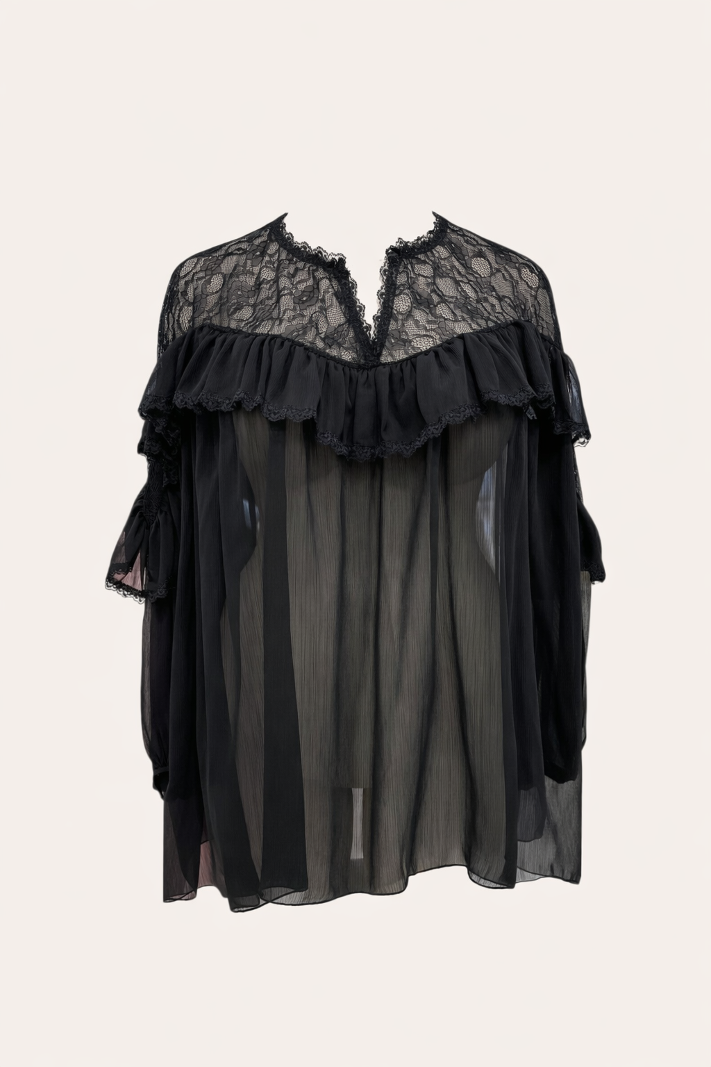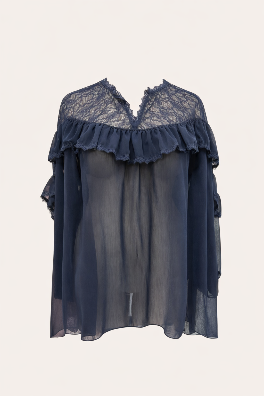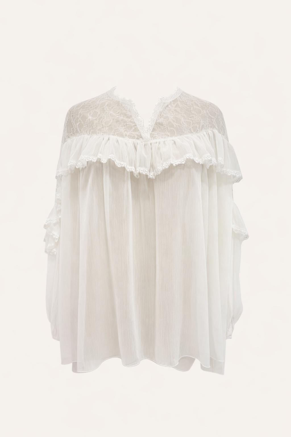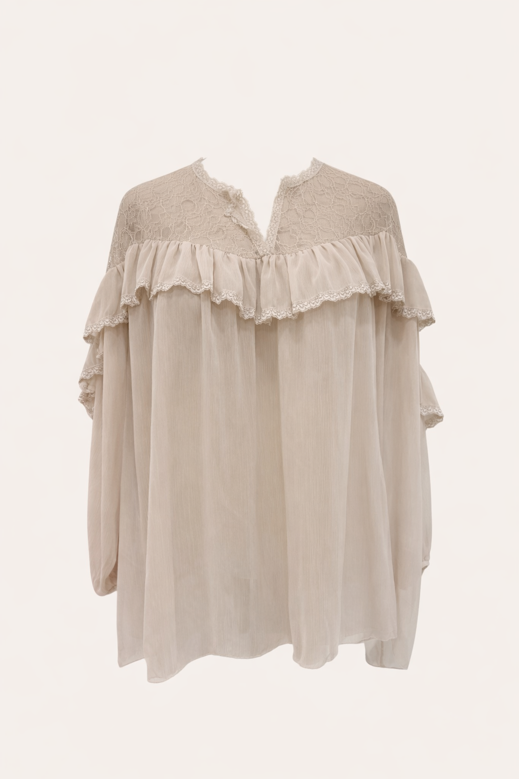 Cette blouse grande taille en voile léger de la marque CMélodie, séduit par sa douceur et sa féminité. Son empiècement en dentelle délicate et son volant apportent une touche élégante, tandis que sa coupe fluide respecte parfaitement les morphologies généreuses. Les manches longues sont resserrées par un élastique aux poignets, offrant un joli tombé sans effet bouffant excessif.