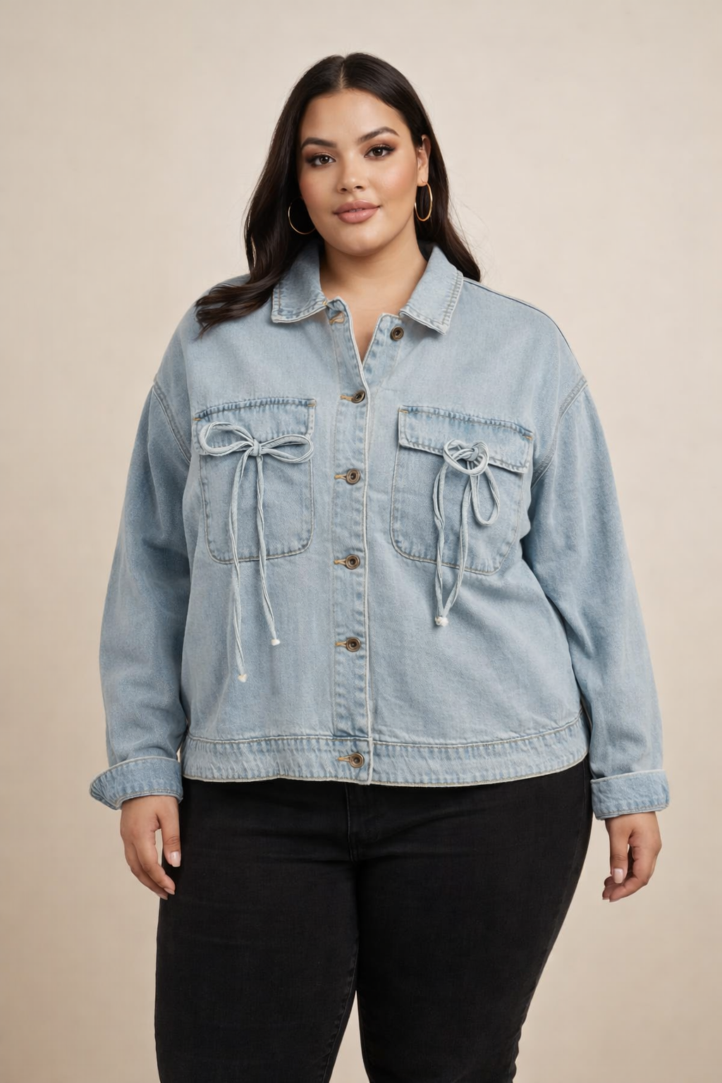 Adoptez cette veste en jeans bleu clair grande taille à la coupe confortable et moderne. Ses poches poitrine avec nœuds apportent une touche féminine originale, tout en restant facile à associer au quotidien.